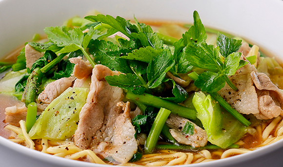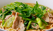 - 熱湯、麺を入れゆでます。ほぐさずに1分経ったら箸でひっくり返し、軽くほぐします。せりを入れ30秒程度ゆで、火から下ろします。