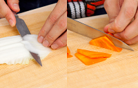 ほたては横に2等分にし、Aで下味をつけ、片栗粉をまぶしておく。白菜は葉と芯を分け、芯はそぎ切りにし、葉は5cm幅に切る。にんじんは皮をむき、斜め2等分に切り、薄切りにする。ヤングコーンは縦半分に切り、斜めにそぎ切りにする。