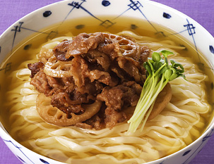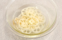牛切り落とし肉は食べやすい大きさに切る。れんこんは皮をむき、3mm厚の薄い輪切りにし、水にさっとさらし、水気をきる。かいわれ大根は根を切っておく。