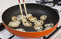 熱したフライパンにサラダ油を入れて、れんこんに焦げ目がつくまで表裏それぞれ、2分ほど焼く。(※焦げ目をつけるように焼くと、香ばしさが増す。)(※ムービー参照)