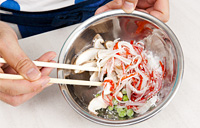 かにかまぼこは手でほぐし、しいたけは薄切りにして、グリーンピースと合わせておく。