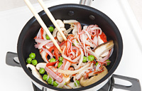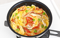 熱したフライパンにごま油小さじ1とかにかまぼこ、しいたけ、グリーンピースを入れて、中火で1分ほど炒め、いったんフライパンから中の具を取り出し、これをSTEP.1の溶きたまごに加えてさっと混ぜる。