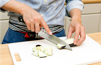 なすはへたをとり、縦半分に切った後、乱切りにする。ピーマンはヘタとタネを取り除いて、乱切りにする。