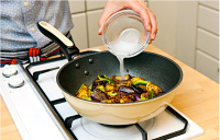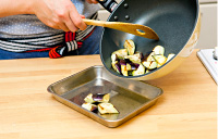 熱したフライパンにごま油を入れて、なすを皮を下にして並べ、フタをして2分蒸し焼きにする。その後一度取り出しておく。