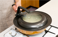 ごま油を入れ、フタをして強火で蒸し焼きにする。